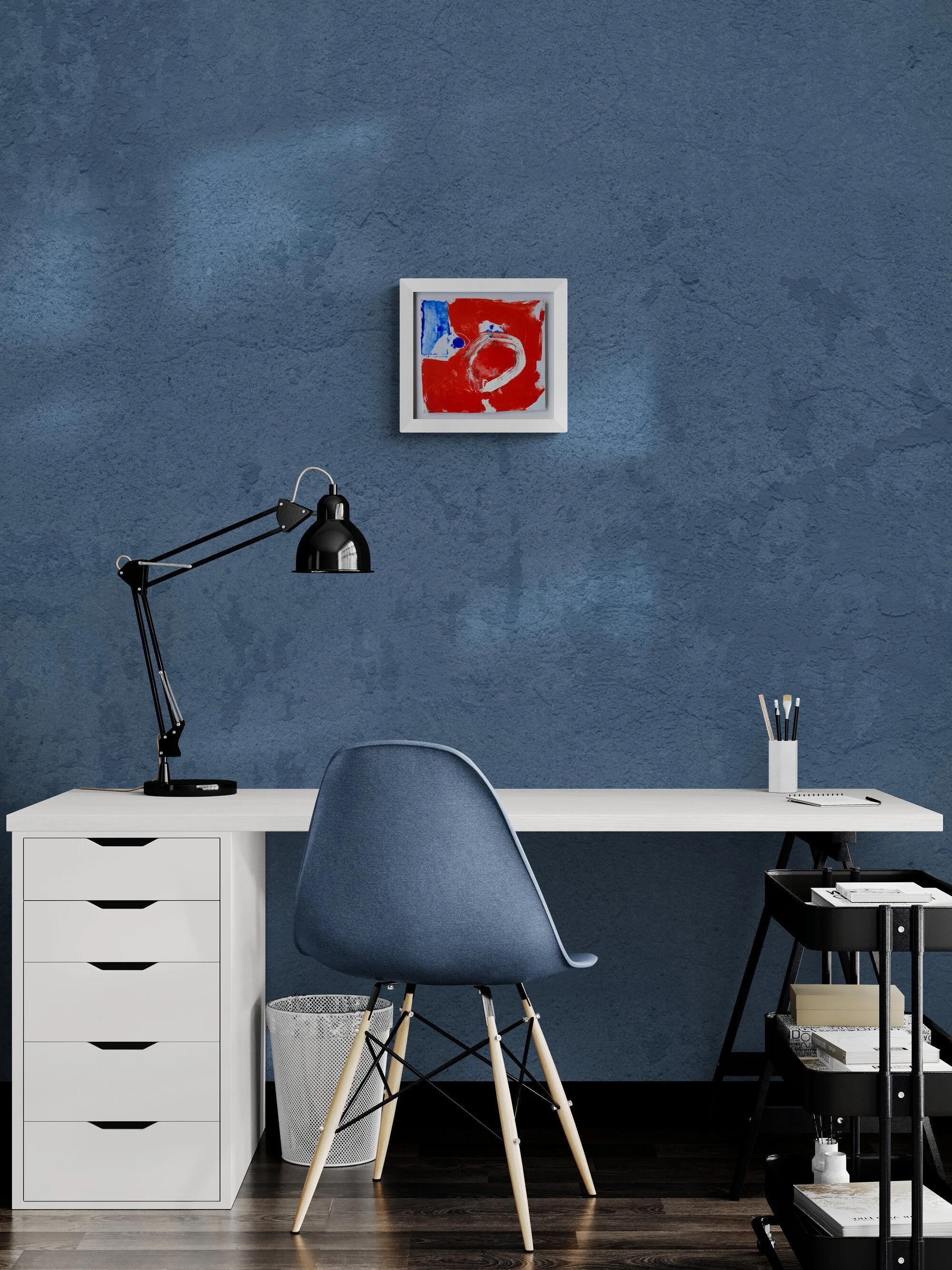 Floated in an open frame of white wood